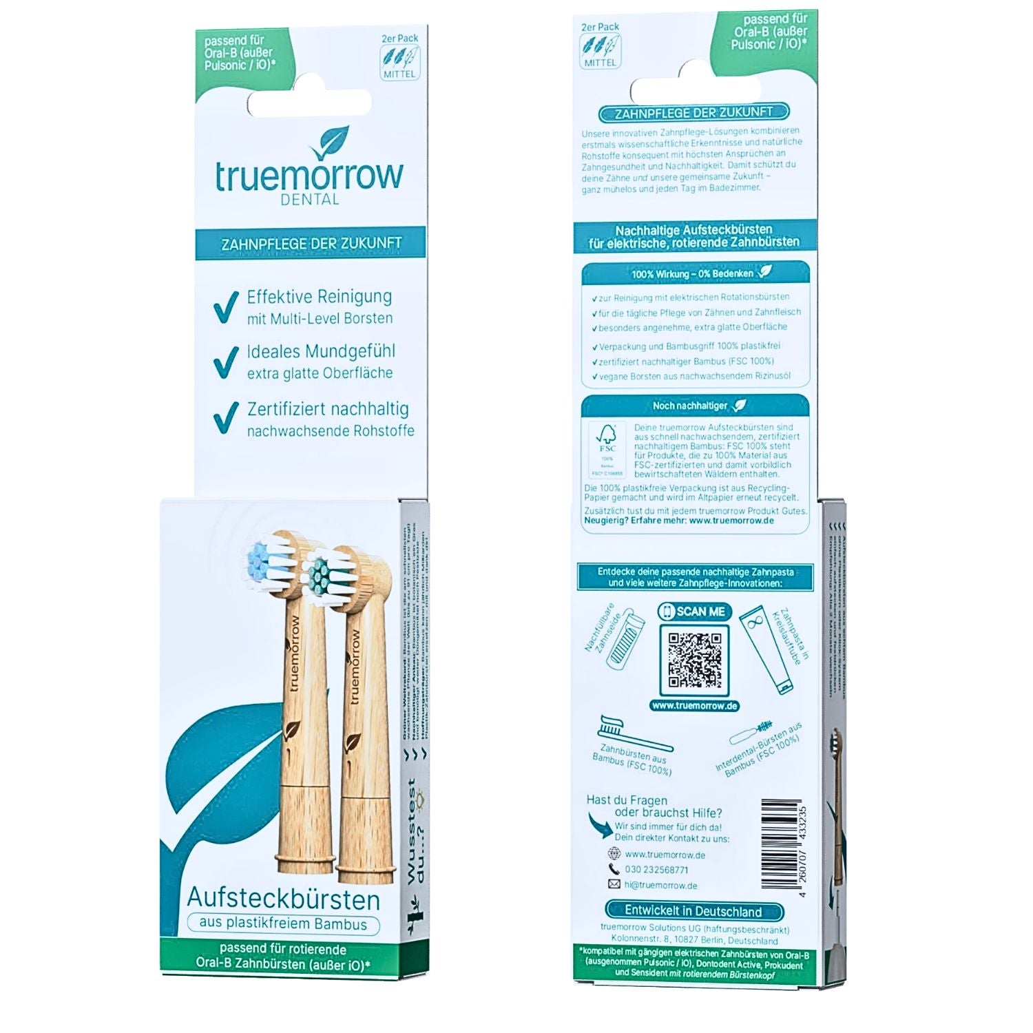 Deine nachhaltigen Aufsteckbürsten von truemorrow stellen wir aus nachwachsenden Rohstoffen her. Der Griff besteht aus zertifiziert nachhaltig angebautem Moso-Bambus (FSC 100%). Er ist zu 100% plastikfrei, hat also auch keinen versteckten Plastikkern. Die veganen Premium Borsten basieren auf rein pflanzlichem Rizinusöl und sind frei von BPA. Nutze deine Aufsteckbürsten wie gewohnt mit deiner Schallzahnbürste, aber ohne das schlechte Gewissen, deinem Planeten durch noch mehr Plastikmüll zu schaden. Entwickelt für dich und deine tägliche, nachhaltige Zahnpflege. Deine neuen Aufsteckbürsten sind 100% vegan.
