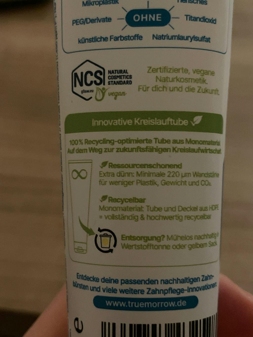 In deiner natürlichen Zahnpasta von truemorrow findest du nur die besten Inhaltsstoffe, und die sind bei uns sogar NCS-vegan zertifiziert. Nach über einem Jahr Forschung haben wir für dich eine Zahnpasta entwickelt, die erstmals allen modernen Ansprüchen an Umweltschutz, Gesundheit und medizinisch bewährte Zahnreinigung gleichermaßen gerecht wird. In vielen handelsüblichen Zahnpasten finden sich unnötige und teils sogar bedenkliche Inhaltsstoffe. Natürlich nicht bei uns, denn deine natürliche truemorrow Zahnpflege ist Naturkosmetik-zertifiziert und:
